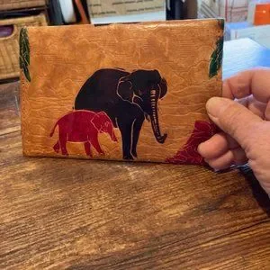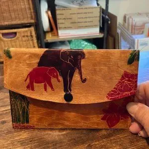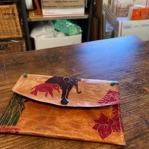 Vintage multicolor leather embossed elephants' small clutch/wallet. It is 7 inches by 4 1/2 inches. It has 3 inside pockets, one that is zippered.