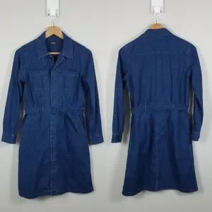 A.P.C. Indigo Chambray Denim Minimalist Cotton Knee Length Belted Shirt Dress M