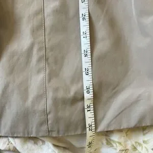 This short trench coat is in excellent used condition. No stains or damage. Double breasted, with pockets. Check measurements for proper fit.