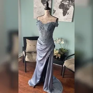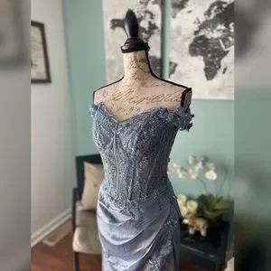 New with tags! Gorgeous Smokey light blue sweetheart off shoulder evening gown. Bustier style corset top with lace details. Sexy leg slit. Tag sz L, runs smaller. Cinderella/ladivine brand