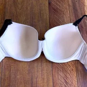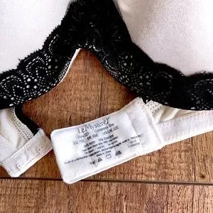 Le Mystere, size 32E for US/UK, 70E for EU, 85E for FR. Shimmering off-white with black lace trims. Very gently worn and still in great condition.