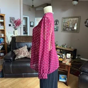 French Connection red & white sheer long sleeve blouse with buttoned cuffs. Buttons down the front. Black buttons. Size L. Armpit to armpit is 23 inches, length is 26 inches. Material is 100% polyester. In new condition.