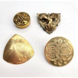 Add a touch of vintage elegance with three Gold Tone Dress Clips and a Button Cover. These will elevate any vintage outfit or blouse with their golden hue and intricate detailing.