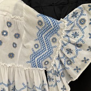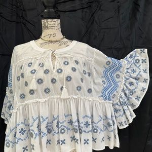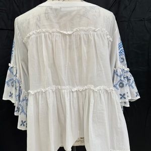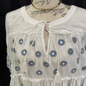 Anthropology, Pure US, white/blue embroidered, short sleeve, ruffle boho/ peasant blouse with tie at neck with tassel, white cotton tiered, embellished with embroidery and crystals, 100% cotton, size M , excellent used condition