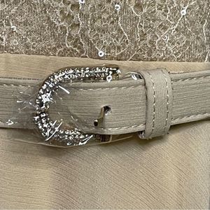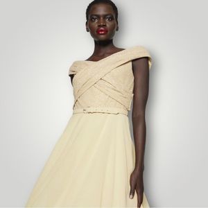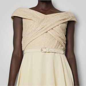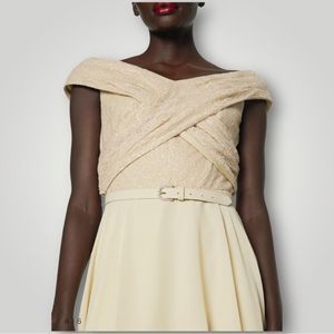 Off the shoulder crisscross sequined lace with full chiffon skirt