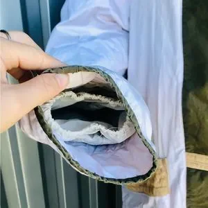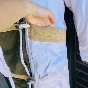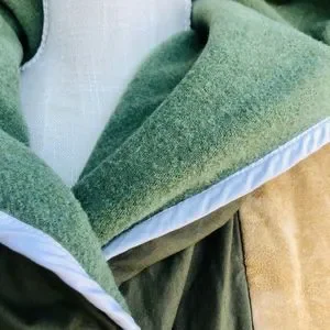 What an amazing piece! Truly one of a kind with incredible detailing throughout. Features hook and eye front closures with bone catches and suede detailing, along with a full body zip closures. Fully lined with down material and included fleece lined hood as well. The ivory material is as snow-resistant and the whole coat is wind resistant. Features deep front pockets and quilted interior.