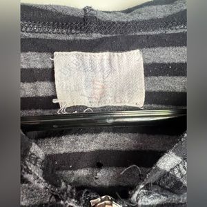 Black & grey stripes with pink/purple graphic BKE on front, 1967 on lower back. Thin, slightly sheer cotton material. Small hole below neck label, but it’s covered by the hood so I never noticed it until taking pics.