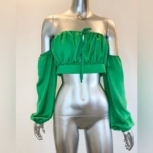 Superdown crop top green satin off-shoulder balloon sleeve blouse M