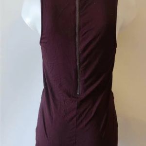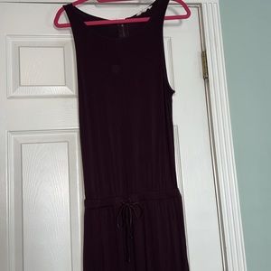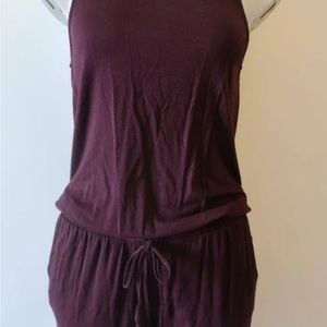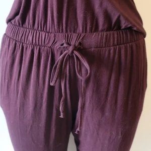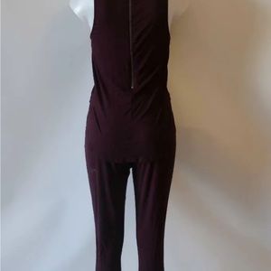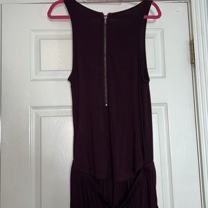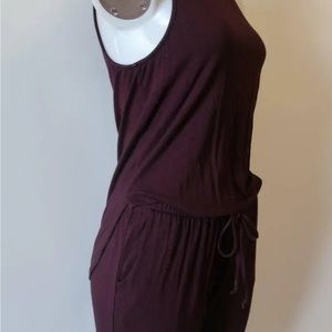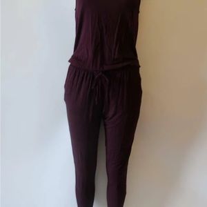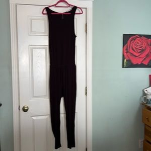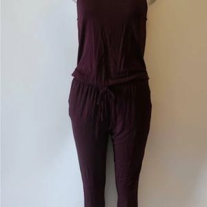 Super cute maroon/eggplant sleeveless jumpsuit with cutout back, drawstring waist, side pockets and zipper in back! Perfect for a night out!!! Pre loved no flaws!
