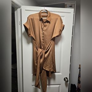 Brown button down dress made of satin. Buttons all the way up. Dress has tie-front detail; ties unwrap completely for adjustable fit. Measurements shown. Very cute with heels!
