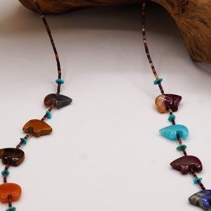 Vintage Southwest Native American Bear Fetish Multi Gemstone Necklace 30"