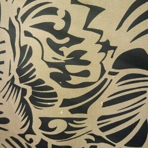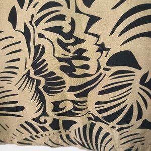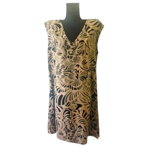 Santiki Tan and Black Tropical Printed Sleeveless Boutique Dress, Size Small, GUC. This lovely boutique dress is sleeveless and has a complementing v-neck collar. It has only been worn and washed a few times. There are a few hard-to-see bleach spots near the bottom of the front as shown in the photos. This lightweight, black and tan printed dress is very flattering.