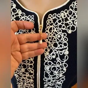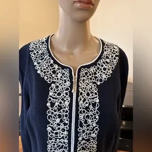 -from my closet,whether you wear on top of dress or style w/separates, this gorgeous sig knit St. John Collection jacket is embellished w/beautiful luminous faux pearls & white rope detail to dress up any look