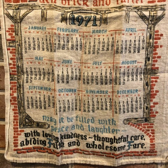 Vintage 1971 linen calendar wall hanging featuring a house prayer and angelic figures. Ideal for blessing a new home or as a vintage decor piece.
