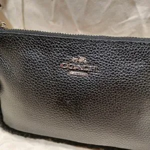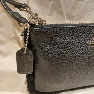 coach all pebbled leather wristlet, in EUC, 7x4 in size, zip to close, all silver hardware, trimmed in black wool, from a smoke free home