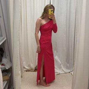 Worn once;) sleek sexy and chic barbiecore pink nylon dress. Amazing fit and comfortable too. Chic with a flip flop on a beach or worn to a wedding;) Size S.