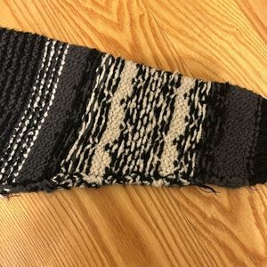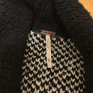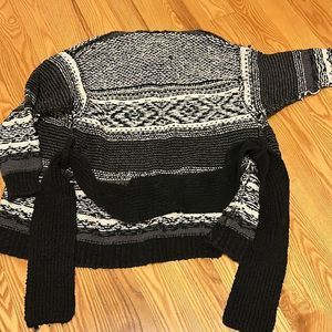 Soo comfy and cozy - inside out cardigan! One small hole in the back..hardly noticeable. Thick black tie front. Gray, white, black.