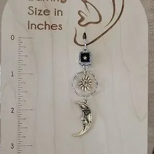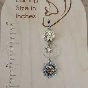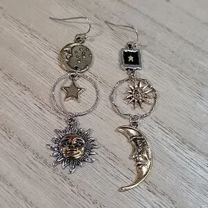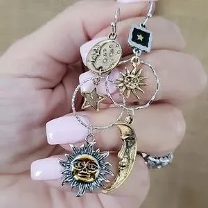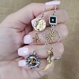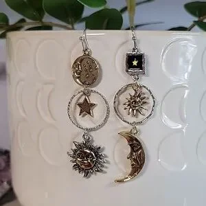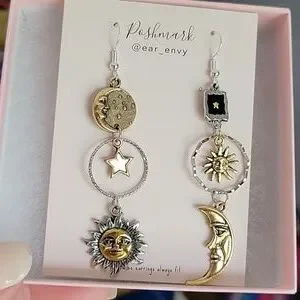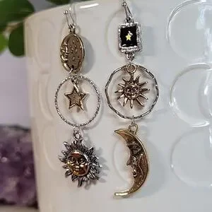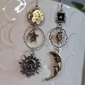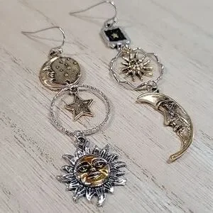 Mismatched contrasting sun, moon, and star dangles with lots of detail.