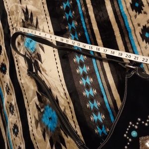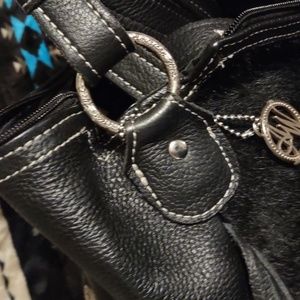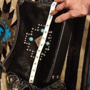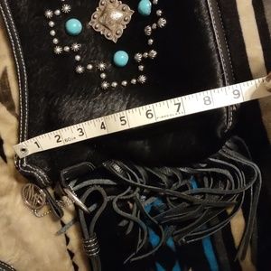 Adjustable Shoulder strap. Crossbody or shoulder. Cow fur on front. Very well made real leather bag. Kept in dust bag. Comes with Original dust bag. Hardware is Silver. No stains, rips or tears. Excellent Condition. Fabric inside. Has three pockets( shown in photo) Measurements shown. Turquoise looking stones.
