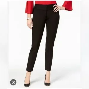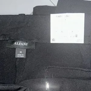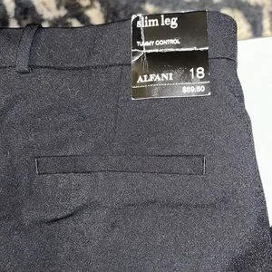NWT Alfani slim leg tummy control pants in size 18. Deep black color. Size for front hook and zipper closure. Front and back pockets. Waist is about 42”. Hip is about 48”. Inseam is about 30” full length is about 41”. Pant is being stored in a storage box and is wrinkled and will need pressing.