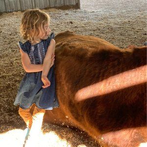 This denim girl's dress by Lucky Brand is so cute on. It has embroidery on the front and a little bow on the waist. It's in excellent condition with no holes or stains.