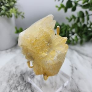 This rare piece of iridescent calcite comes from the Smith quarry, Black Rock Lawrence County Arkansas and hasn't been mined since the 1980s. This piece does have some light damage around the tips but still is a notable piece to have in a collection due to it being out of production. It weighs approximately 7 ounces and is 3 inches by 2 1/2 inches. Spiritually, calcite is known for creativity and confidence.