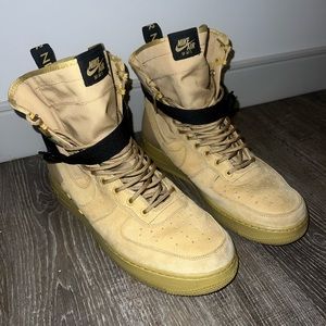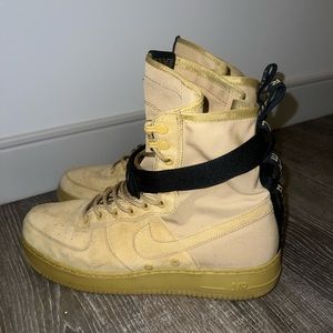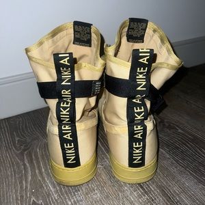 Taking its cues from the military-inspired Nike Special Field boot, the Nike SF Air Force 1 High ‘Wheat’ features a shaft high enough to merit two removable ankle straps—one in black nylon with special branding, the other made from ballistic nylon in a seasonal Wheat brown. That color informs the entire sneaker, except for black ankle straps, heel tabs and branding on the tongue (which contains a secret pocket). The upper consists of full-grain leather on top of a rubber sole.