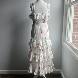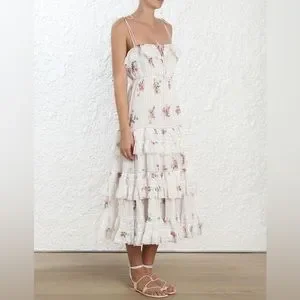 Zimmermann Heathers pintuck midi cotton dress in “floating bouquet” print with adjustable straps and waist tie
