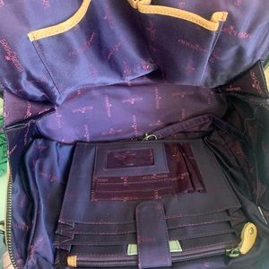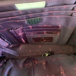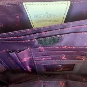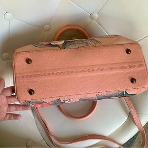 Vibrant Anushchka handbag pretty peach color hand painted flowers and birds on leather. Zipper opens wide with lots of compartments and a zip slit pocket. Crossbody strap included. Purple lining. Lightly used but in great condition. Smoke-free animal friendly home.