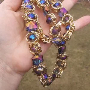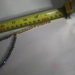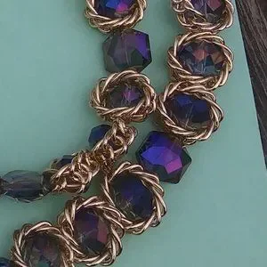 New Eye Candy Los Angeles two strands statement necklace 14 Kt gold plated alloy has that aurora borealis glint sparkle in the bluish purplish color spectrum it glistens and so sometimes you see bluish and other times purplish see video of the colors dancing in the natural light . New with one manufactire's tag . Measures at the longest ~ 20 inches tape measure in pictures above , questions are always welcome . Mannequin's neck measures 15".