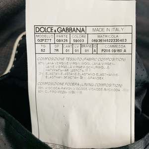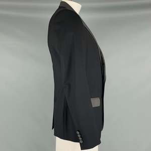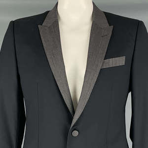 in a black and grey wool blend fabric featuring peak lapel, single vented back, and double button closure. Made in Italy.Very Good Pre-Owned Condition. Marks under arms.