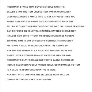 -I PLACE MUCH IMPORTANCE ON BUYERS WHO HAVE PREVIOUSLY PURCHASED FROM ANY BUYER ON POSHMARK AND FOLLOWED PROPER PROTOCOL-ACCEPTED PURCHASE IN A TIMELY MANNER, LEFT A STAR RATING & A LEFT AN OPTIONAL KIND COMMENT.REVIEW MY NUMEROUS FEEDBACK RECEIVED FROM MY VALUED CUSTOMERS