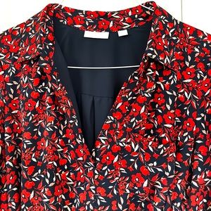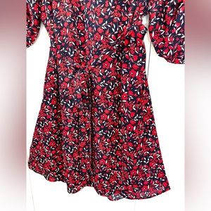 NY&Co Midi Dress w/ Red Floral Print on Navy, 3/4 Sleeve V-neck Belted sz L