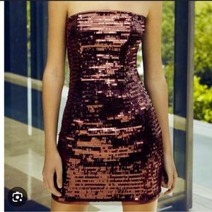 Beautiful sequin dress ! Haney Naomi Strapless Sequin Mini Dress Red Wine. Naomi dress is the perfect party mini strapless with an exposed zipper and stacked sequins. 100% Polyester Dry clean only Polyester,Spandex Includes inner optional straps with snap closure Inner elastic around bust for support Inner side structure panels Embellished reflective sequin throughout Bodycon style Lined.
