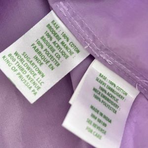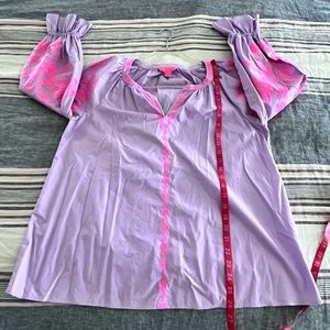 Lavender with hot pink embroidery on full balloon sleeves with a ruffle cuff.
