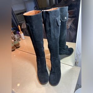 Description: Black suede Wedge heel high boots with working pockets on the shaft. Full zipper for easy on/off. Very soft full leather lining.