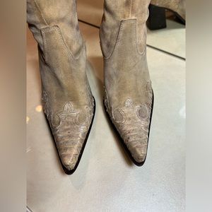 Description: Very Unique distressed suede Vintage boots with studs and snake skin accents. Full zipper and leather lined. You won't see another pair these vintage boots.