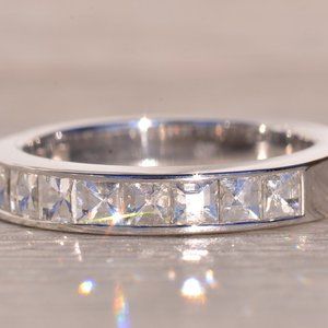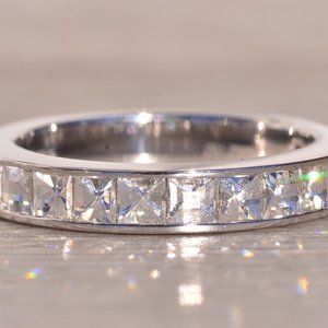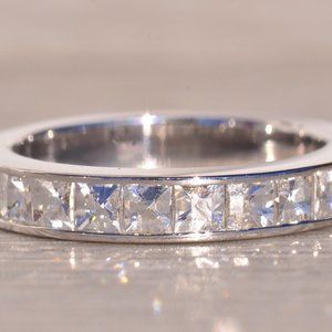 The Bez: Designer Signed Blaze Cut Natural Diamond Band in White Gold. This stunning band boasts a total of 1.40 carats of specialty Blaze Cut natural diamonds, meticulously channel-set across the center. Renowned for their exceptional brilliance, the diamonds exhibit remarkable approximate GIA clarity grades ranging from VVS2 to Vs1, with a color grade spanning from F to G. Crafted with precision and finesse, the band is fashioned from lustrous 18 karat white gold. Currently sized at 6.5, the ring offers flexibility with the option for adjustment to any finger size for an additional fee upon request. Designed by the esteemed Bez Ambar, this masterpiece bears his signature, representing unparalleled craftsmanship and exquisite design. Each diamond is expertly cut in the distinctive Blaze Cut style, renowned for its exceptional fire and brilliance, adding a touch of luxury to the piece.