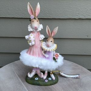 This charming figurine features two precious bunnies dressed in fluffy tutus and holding Easter eggs.