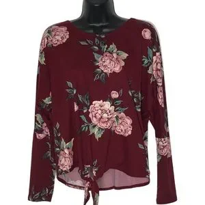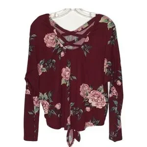 Very soft polyester and spandex boxy long sleeve boat neck knit top with a tie front and strappy crisscross scoop back. Batwing sleeves, rounded hem. Excellent preowned condition. Size M.