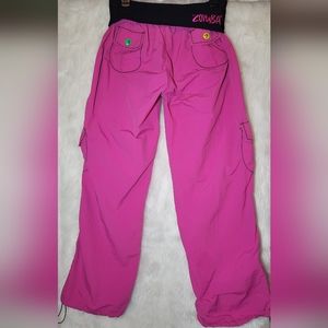 Vintage Zumba Cargo Pants in the color Pink/Fushia. 90% Nylon, 10% Spandex. Stretchable Waist Band and has Zumba on back. Colorful buttons in Green, Yellow. Pants can be rolled up and secured with a strap and snap button. Bottom of pants agave a drawstring cord. Super cool and comfy!