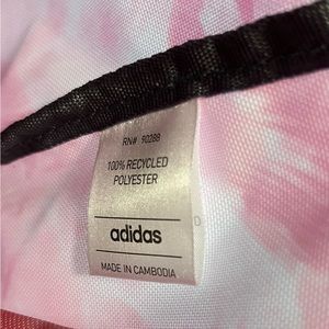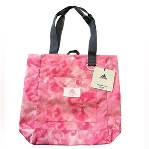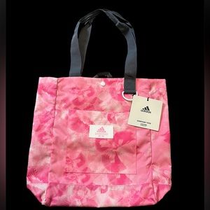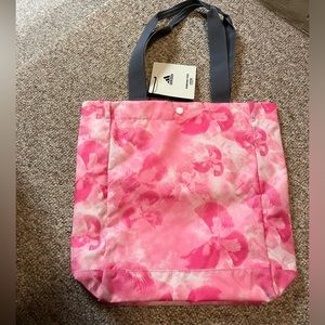 💯 % recycled polyester fabric with floral detail iconic brand name logo tag on front slip pocket interior zipper pocket interior mesh side pocket snap top closure double handles and top grab loop color is Essential Floral Bliss Pink Brans New With Tags Never been used