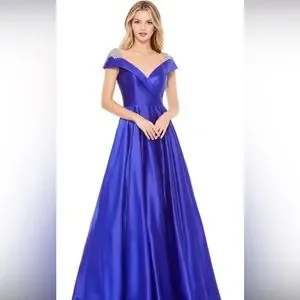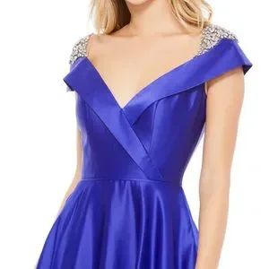 Mac Duggal 49239 cobalt blue mother of the bride dress is fashioned in luxe satin, with a collared portrait neckline and rhinestone-encrusted cap sleeves. This A-line evening gown finishes in a concealed back zipper closure.