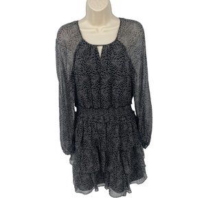 cinq a sept Black Mini Dress Sz 6 Tiered Print Silk Long Sleeve Smocked Babydoll