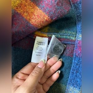 Great condition women’s multicolor plaid coat with one button in the front and pockets on each side.