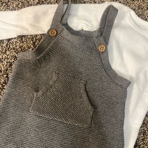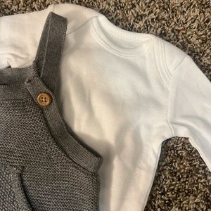 New baby outfits comes with white, long sleeve, bodysuit, and gray, crochet overalls.