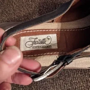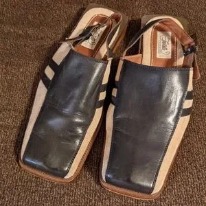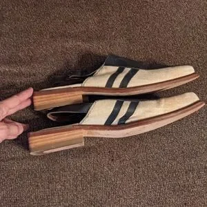 I absolutely could not resist picking up these utterly cool Miami Vice cocaine chic sandals. So well made with leather lining and upper and heavy linen sides with leather racing stripes! Back strap adjusts with buckle, 1" stacked wood heel. I don't think they're vintage but sure have a retro vibe. Excellent condition with a couple of small nicks in the heel.