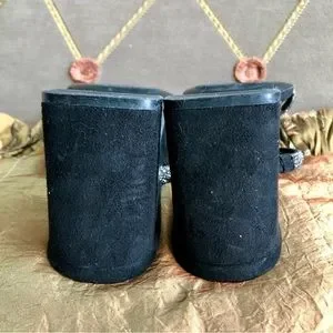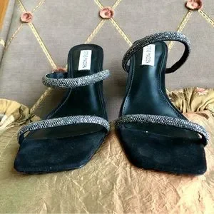 Beautiful sparkly high heel slide sandals, silver sparkles and black faux suede, style is lilac