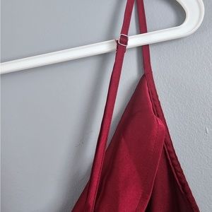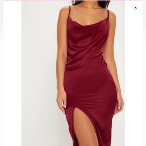 Elevate Your Style with our Burgundy Strappy Satin Midi Dress - Perfect for Any Occasion! Make a statement in our alluring Burgundy Satin Midi Dress. Featuring a flattering cowl neck and delicate straps, this dress exudes elegance and sophistication. Its soft satin fabric drapes beautifully, highlighting your curves. Perfect for weddings, date nights, or any formal event!" - Flattering cowl neck - Delicate spaghetti straps - Soft satin fabric - Elegant midi length.