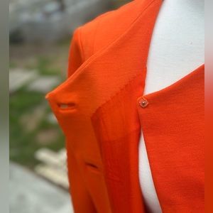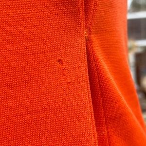 This orange retro dress is fantastic with a few flaws. There are some stains on the sleeve and snags/small holes as shown. She is an x-small/0. Brand is Fannie Original.